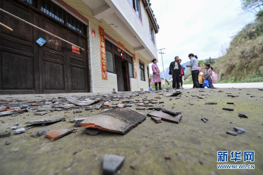 3月30日,新柳村一户居民家门前落满瓦砾。当日,贵州省黔东南苗族侗族自治州剑河县发生5.5级地震。初步统计,地震已造成剑河县2200余户1.3万人受灾。目前,暂无灾区房屋倒塌、牲畜死亡等情况报告。记者第一时间进入位于震中的剑河县南加镇新柳村,直击地震灾区现场。新华社记者欧东衢摄