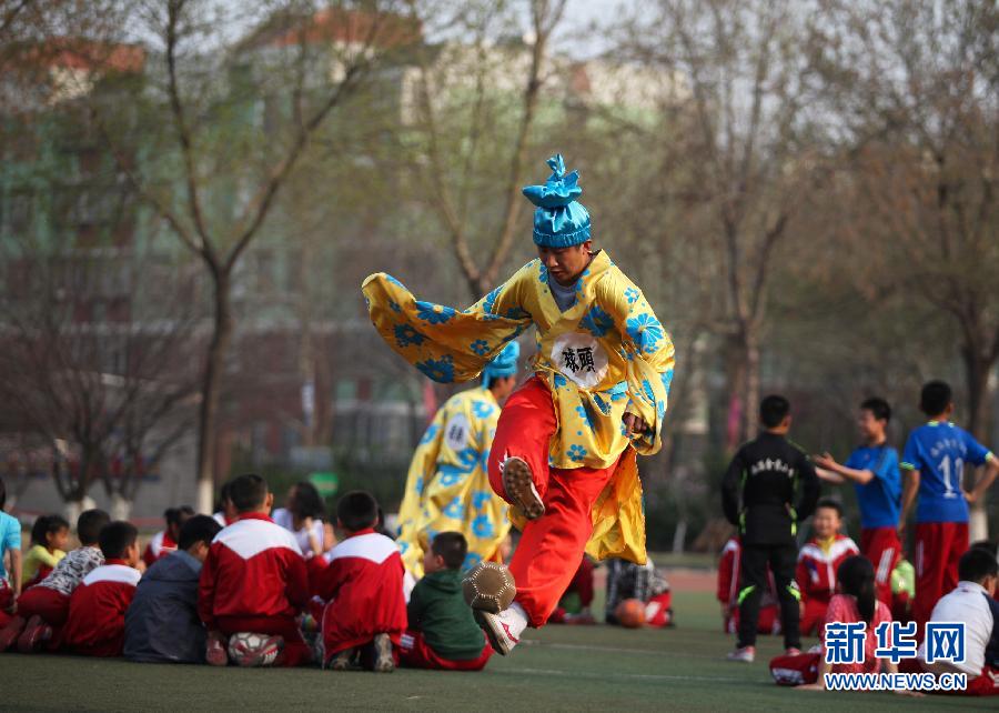 3月30日,在山东省淄博市临淄区金茵小学,一名专业队员为学生们表演蹴鞠。