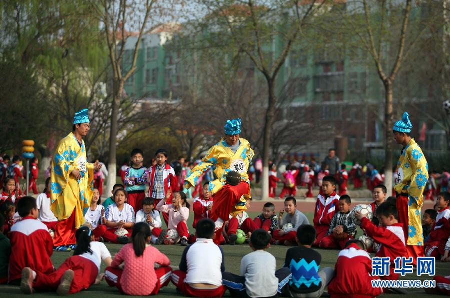 3月30日,在山东省淄博市临淄区金茵小学,几名专业队员为学生们表演蹴鞠。