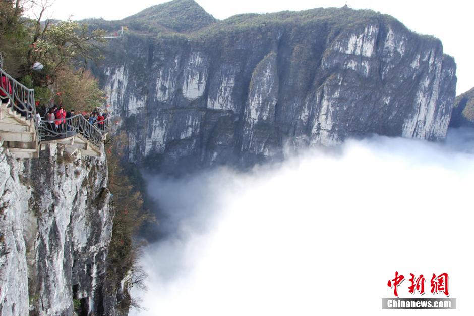 3月30日,湖南张家界天门山出现壮观云海,在玻璃栈道下方还出现难得一见的佛光。数千游客共同见证了这一奇观美景,纷纷兴奋地拿着相机、手机拍个不停,直叹眼前任何一个角度的美景都是一张美丽的明信片。丁云娟 摄