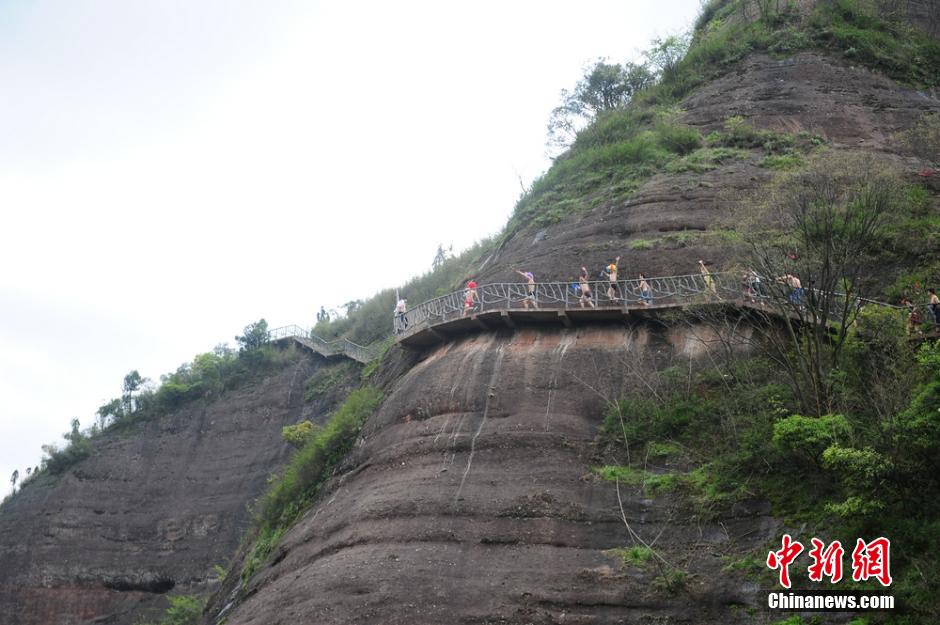 3月31日,2015湖南通道万佛山“光猪跑”开跑,数十位游客与当地侗族人赤裸着上身奔跑在悬崖峭壁间,以此呼吁保护当地优美的自然环境,低碳出行。 杨华峰 摄