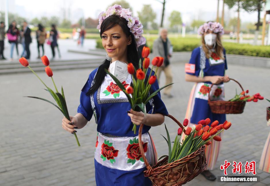 3月30日,六位靓丽“花仙子”统一着装来到南京仙林地铁二号线沿线新湖仙林翠谷,戴着过滤式口罩向过往的市民分发郁金香,以此提醒人们对空气环境的关注、倡导绿色环保生活。中新社发 泱波 摄