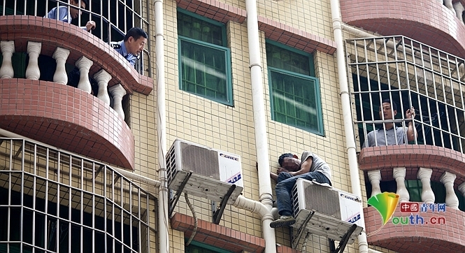 昨日中午12时,该男子坐在宾馆后面外墙4楼一个空调上,地上有多名巡防队员和消防队员在待命,一名民警正从宾馆4楼的阳台上探出头来劝说他,当时该男子待在墙上的时间已经有32个小时,但不管如何劝说,他都不愿意下来。