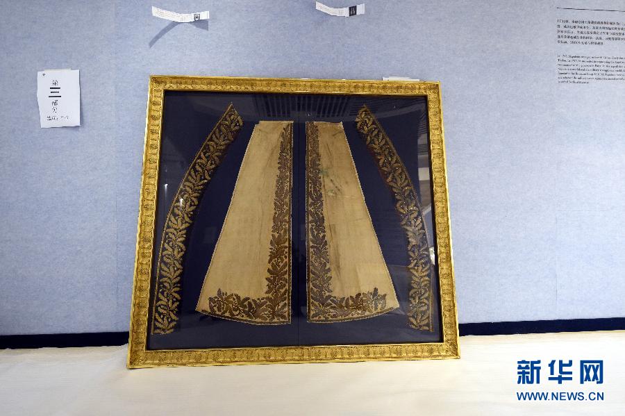 3月30日,参展文物“元帅乌迪诺的加冕外套”摆放在展厅,准备悬挂上墙。