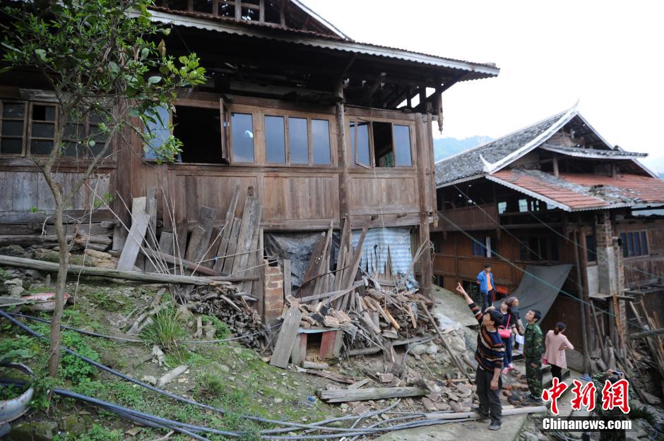 贵州省黔东南苗族侗族自治州剑河县30日发生5.5级地震。据贵州省民政部门统计,截至30日15时地震已造成剑河县2200户13014人受灾,3100间房屋遭受瓦片掉落、墙面开裂等不同程度损坏。震感最为强烈的南加镇部分通村水泥路路面出现不同程度开裂情况。目前,暂无灾区房屋倒塌、牲畜死亡等情况报告。图为村民在向记者介绍自家受损的房屋。 中新社发 李克 摄