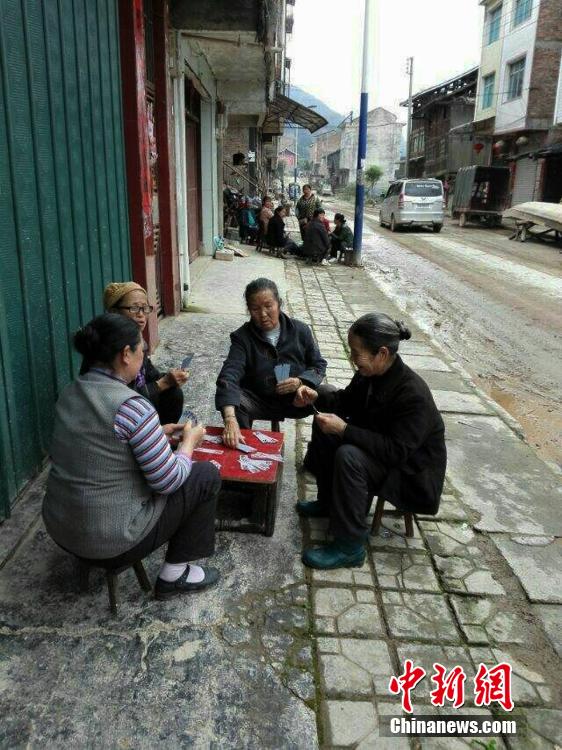 图为震中核心区南加镇集镇马路边打牌的老百姓。 中新社发 欧阳筑 摄
