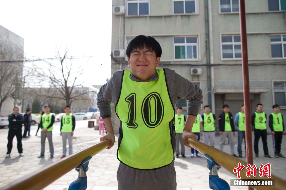 3月30日,山西太原,报考乘务兼航空安全员的男生们进行“铁人六项”体能测试。张云 摄