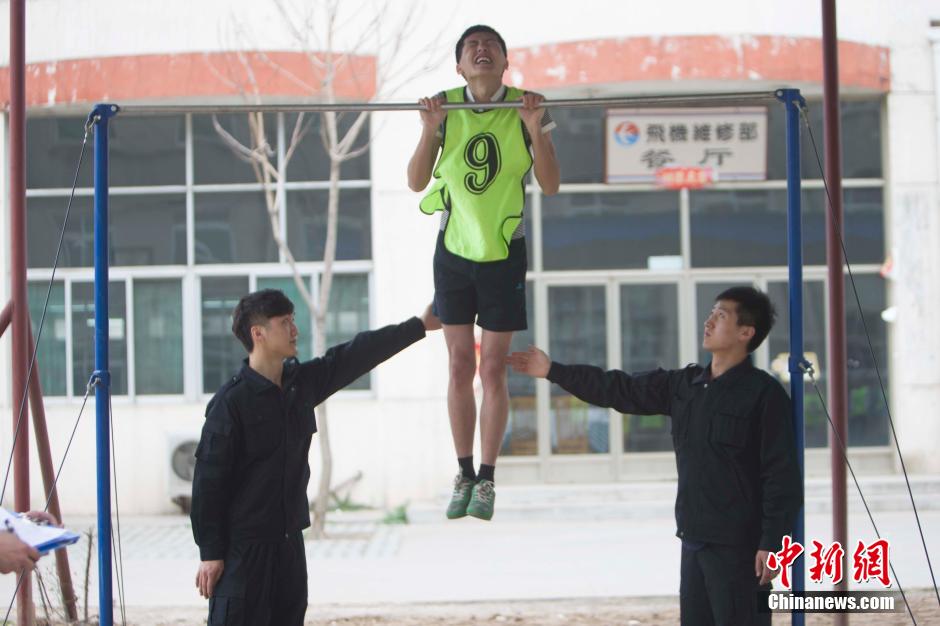 3月30日,山西太原,报考乘务兼航空安全员的男生们进行“铁人六项”体能测试。张云 摄