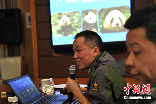 图为成都熊猫基地工作人员介绍几只备选大熊猫的情况。 中新社发 张浪 摄