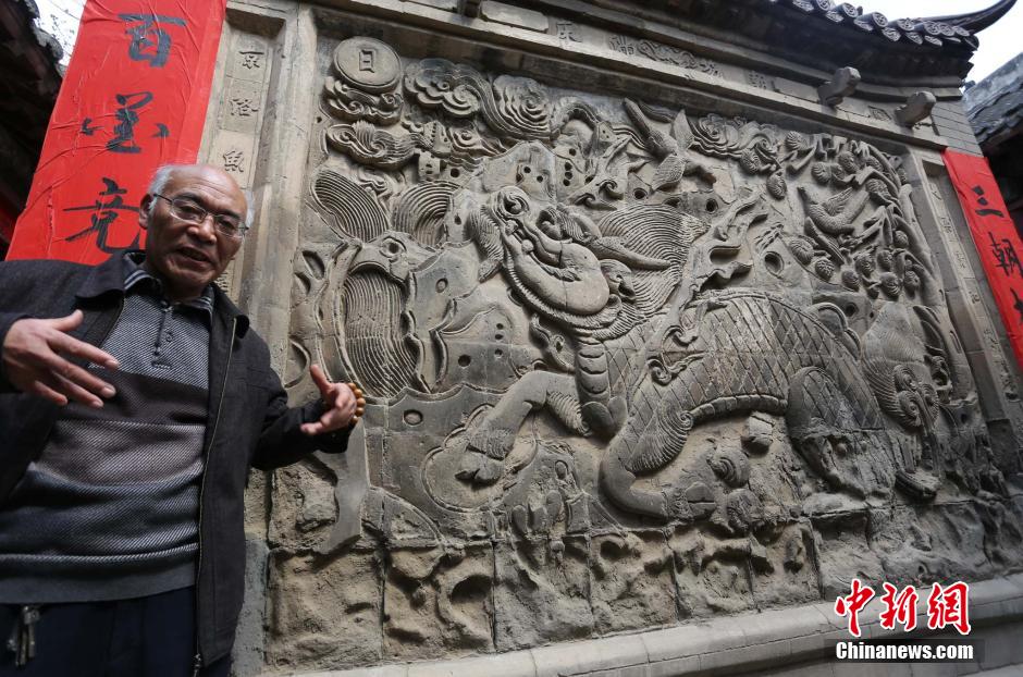 3月30日,河南省郑州市上街区马固村,王氏家庙内的明代“反贪”影壁墙。马固村王氏家庙内有一面明代的影壁墙,青砖雕刻,长、高各3米左右,正面以高浮雕的形式雕刻有一瑞兽“天狗吞日”的图案,左右有对联“大梁清河状元古门第,京洛鱼陵枢副旧世家。”横批:“朝勿满床”。据介绍,影壁墙上的瑞兽为“贪”,日代表太阳,贪吃太阳掉到海里就会死,以此告诫后人为官之道,做官要做清官,不要做贪官,同时也揭示了王氏家族昌盛不衰的成因。该影壁墙被后人称为“反腐影壁墙”。中新社发 杨正华 摄