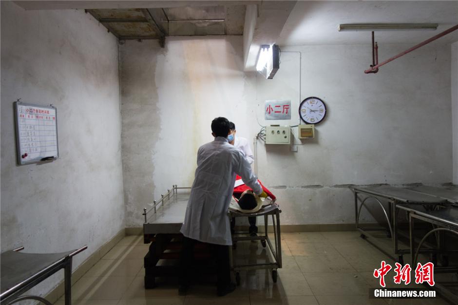 3月31日,广西柳州市殡葬管理处5名遗体化妆师在该市殡仪馆冷藏室进行遗体化妆工作。从冷藏库里搬运出遗体、核实身份,接着给逝者穿衣化妆,最后通过升降梯将遗体运送至告别厅,是他们的主要内容。这个由五名男子构成的化妆组,年纪最大为52岁,其余均为80后和90后。图为3月31日,广西柳州市殡葬管理中心遗体化妆师正在为遗体化妆。黄威铭 摄