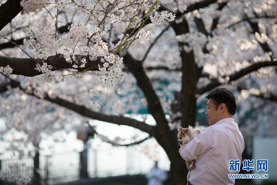 3月31日,在日本大阪,一名男子抱着宠物狗欣赏盛开的樱花。三月末,日本的樱花季如约而至。 新华社记者李木子摄
