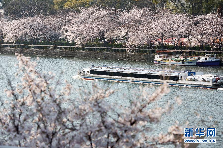 3月31日,在日本大阪,一艘水上巴士在大川河上行驶,两岸樱花盛开。三月末,日本的樱花季如约而至。 新华社记者李木子摄