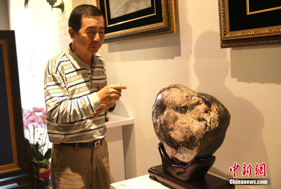 近日,台湾花莲玫瑰石艺术馆内,馆方人员向记者介绍一块呈现出“豹头”形状的石头。该馆内收藏的玫瑰石,因地层挤压和氧化等作用,经人工切割、抛光等工序后,呈现出天象、地貌或其他意境。中新社发 陈小愿 摄