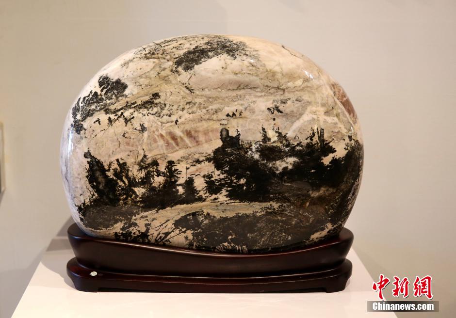近日,记者探访台湾花莲玫瑰石艺术馆。馆藏的玫瑰石,因地层挤压和氧化等作用,经人工切割、抛光等工序后,呈现出天象、地貌或其他意境,犹如山水画。中新社发 陈小愿 摄