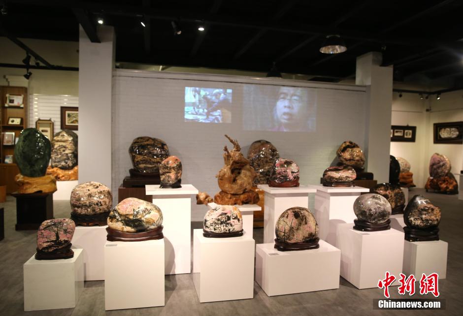 近日,记者台湾探访花莲玫瑰石艺术馆。馆藏的玫瑰石,因地层挤压和氧化等作用,经人工切割、抛光等工序后,呈现出天象、地貌或其他意境,犹如山水画。中新社发 陈小愿 摄