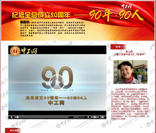 中工网北京4月1日电 2015年是中华全国总工会成立90周年,同时今年还将迎来5年一度的全国先进工作者和劳动模范表彰大会。中工网多媒体中心于4月1日起,推出 “纪念全总成立90周年——90年·90人”大型专题节目。