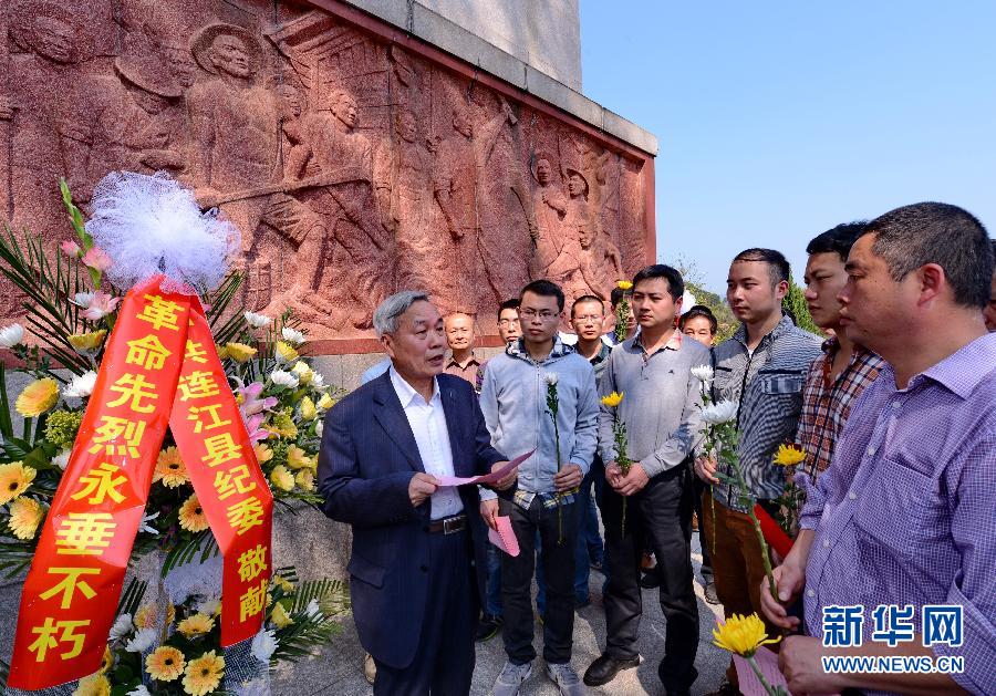 4月1日,连江县党史办工作人员吴用耕(左一)在连江革命烈士纪念碑前向党员干部介绍当地革命史。清明前夕,福建省连江县纪委组织党员干部开展“缅怀革命先烈,牢记党的宗旨”祭扫活动。党员干部通过聆听先烈故事、重温入党誓词等方式,接受廉政教育和爱国主义教育。新华社记者 张国俊 摄