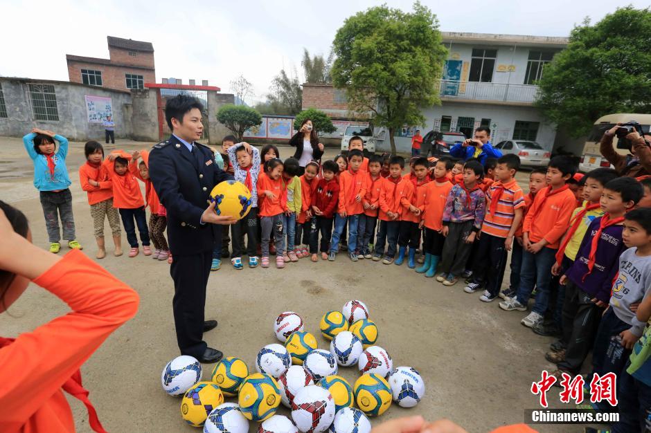 3月31日,在广西柳州市融安县桥板乡阳山村小学,一名柳州市国税局工作人员在为学生上足球课。谭凯兴 摄