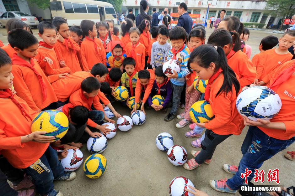 3月31日,在广西柳州市融安县桥板乡阳山村小学,学生们在领取柳州市国税局工作人员送来的足球。 谭凯兴 摄