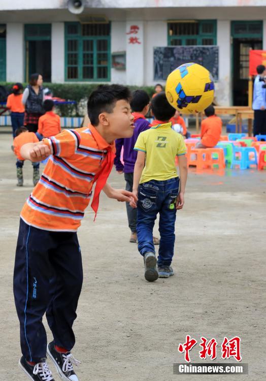 3月31日,在广西柳州市融安县桥板乡阳山村小学,一名学生在练习头球。 谭凯兴 摄