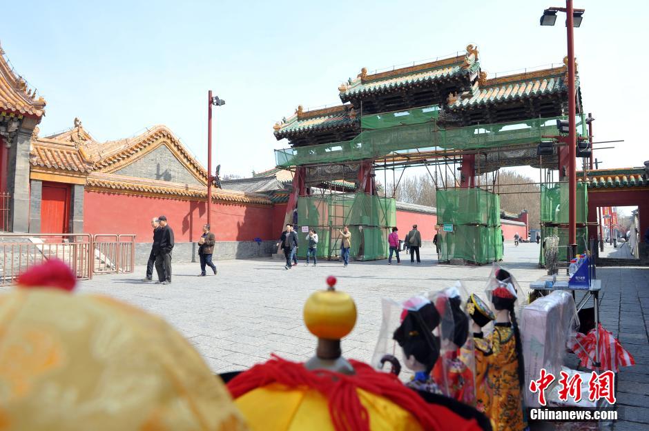 4月1日,沈阳市沈阳路,专业人员对古建筑进行维护。中新社发 孙昊声 摄