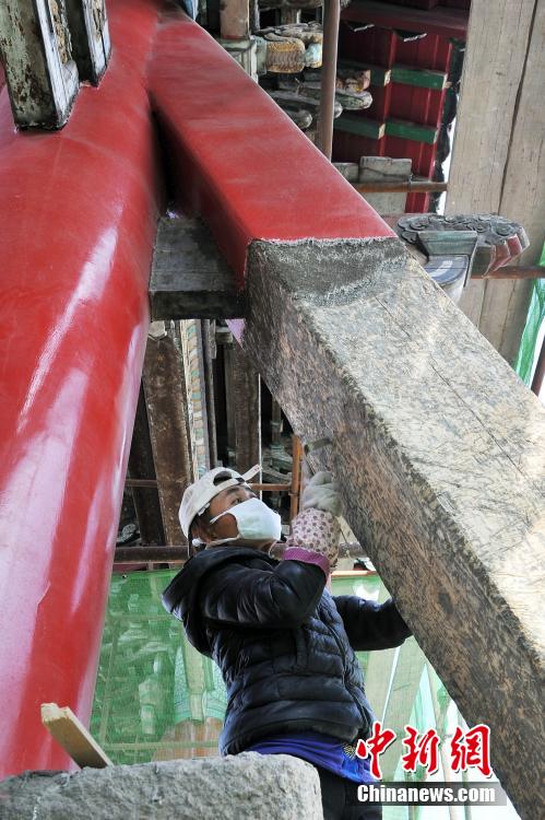 4月1日,沈阳市沈阳路,专业人员对古建筑进行维护。 中新社发 孙昊声 摄