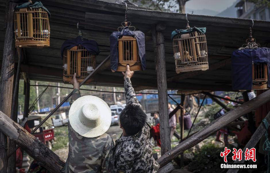 3月31日,几名村民在云南省屏边县湾塘乡观看斗鸟,这里的鸟市自清朝兴起,每天都有人在此比赛斗鸟。 中新社发 张浩 摄