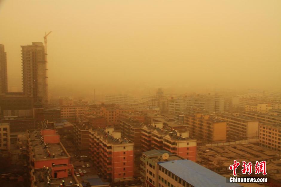 图为4月1日清晨,受新疆强冷空气和沙尘暴的影响,甘肃张掖遭遇今年春天以来的第一次沙尘袭击,整个城市笼罩在沙尘之中。 陈礼 摄