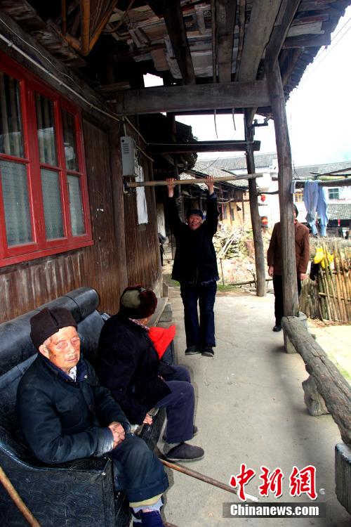 八旬老人在自制的单杠上健身。邓洪涛 摄
