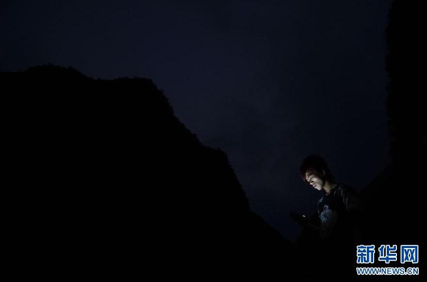 2月17日,22岁的蒙继成在山坳间玩手机,山里手机信号不好。
