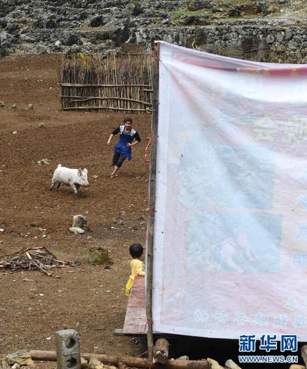 2月17日,在弄勇村弄顶屯,23岁的蓝新在田里追着一头猪。当天,蒙宣友杀年猪,准备动刀时小猪跑了,众人追了整个小山村,最终将小猪拿下。