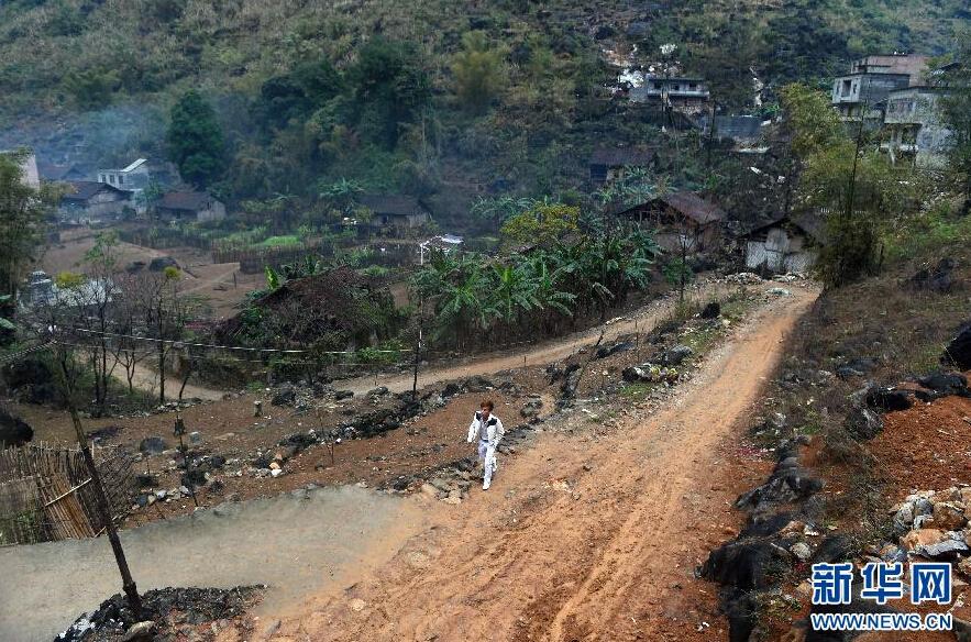 2月15日,在弄勇村弄朝屯,26岁的蓝明先走在乡村小路上。