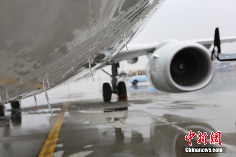 3月31日,一场雨雪天气光临乌鲁木齐,气温骤降10℃,最低气温达-6℃。当日,南航计划在疆执行进出港航班193班,预计承运旅客2.2万人次。据悉,降雪使乌鲁木齐始发出港航班需排队进行除防冰作业,部分航班因此短暂延误。图为飞机表面的结冰。冯明远 摄