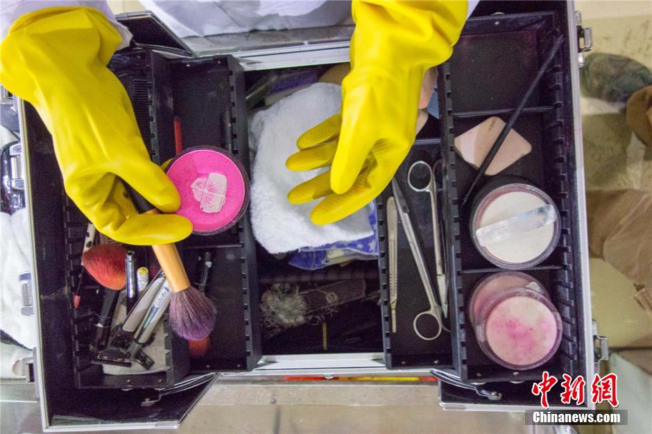 3月31日,广西柳州市殡葬管理处5名遗体化妆师在该市殡仪馆冷藏室进行遗体化妆工作。从冷藏库里搬运出遗体、核实身份,接着给逝者穿衣化妆,最后通过升降梯将遗体运送至告别厅,是他们的主要内容。这个由五名男子构成的化妆组,年纪最大为52岁,其余均为80后和90后。图为遗体化妆用具。黄威铭 摄