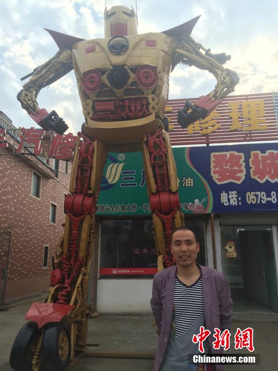 3月31日,记者在浙江省金华市汤溪镇上看到,不少人正围着一尊高6.5米,重3.7吨的“汽车人”合影留念。据了解,而这件作品出自一个仅有初中文化的“修车匠”罗小平之手。罗小平从事汽修20多年了,现在自己拥有一家汽修厂。在一次偶然中,他看到了《变形金刚》中的汽车人,便突发奇想,边做边设计,凭感觉“敲敲打打”、“拼拼凑凑”,最后在店里员工的帮助下,耗时3个月,用几千个废弃的汽车零件制成了这个炫酷的“汽车人”。中新社发 奚金燕 摄