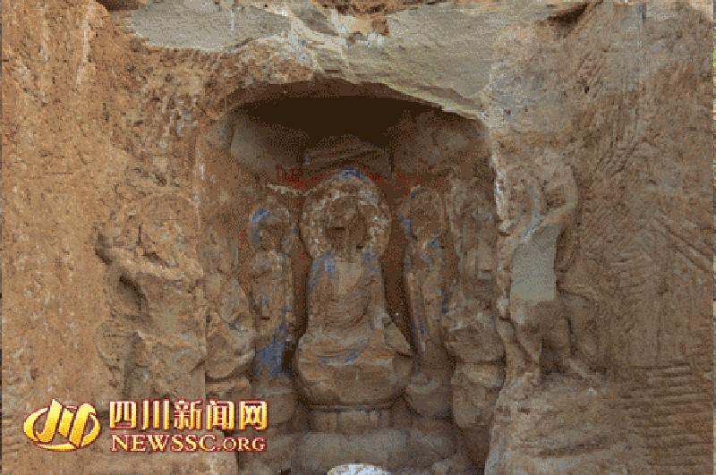 3月28日,在四川阆中市文成镇与五马镇杨家垭村交界处月半湾山庄项目施工过程中发现一处摩崖造像。阆中市文物管理局得知情况后,文物局局长李洪立即带领考古人员赶赴现场进行了详细的调查。经现场实地勘察发现:该处摩崖石刻造像位于阆中市五马乡杨家垭村3社,嘉陵江东岸邓家山普陀岩石壁上,共开凿有唐—清代造像5龛,题刻3处。其中除2号龛无造像,似未开凿完成以外,其余4龛均有佛教造像,共计十余尊,但大都因人为、自然因素损毁、风化剥蚀严重。图为石刻经幢。(张晓东) 图片来源:四川新闻网