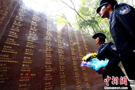 江苏警官学院的两名学员站在英烈墙前缅怀英烈。章善玉 摄