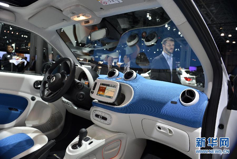 4月1日,一名观众在纽约国际车展上参观新款SMART。当日,2015年纽约国际车展开幕,奔驰、捷豹路虎、凯迪拉克、阿斯顿-马丁、福特等多家国际知名汽车厂商纷纷推出全球首发新车,展示汽车行业所采用的最新科技成果。新华社记者 王雷 摄