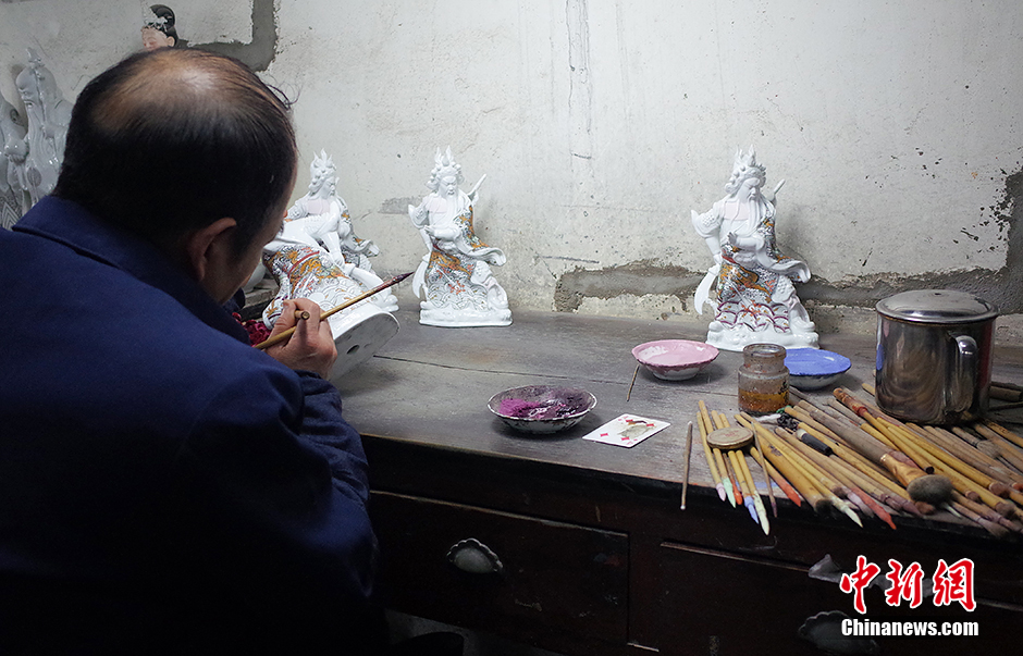 雕塑好的泥坯经过上釉、入窑烧制后,再进行上色的工序,这一步骤称为“釉上彩”。这一步骤需要画工经过漫长而仔细的描绘,使一具单色的瓷器变成彩色的模样。 图为3月30日,江西景德镇,画工正在给一具神像瓷器上色。 中新网记者 李卿 摄