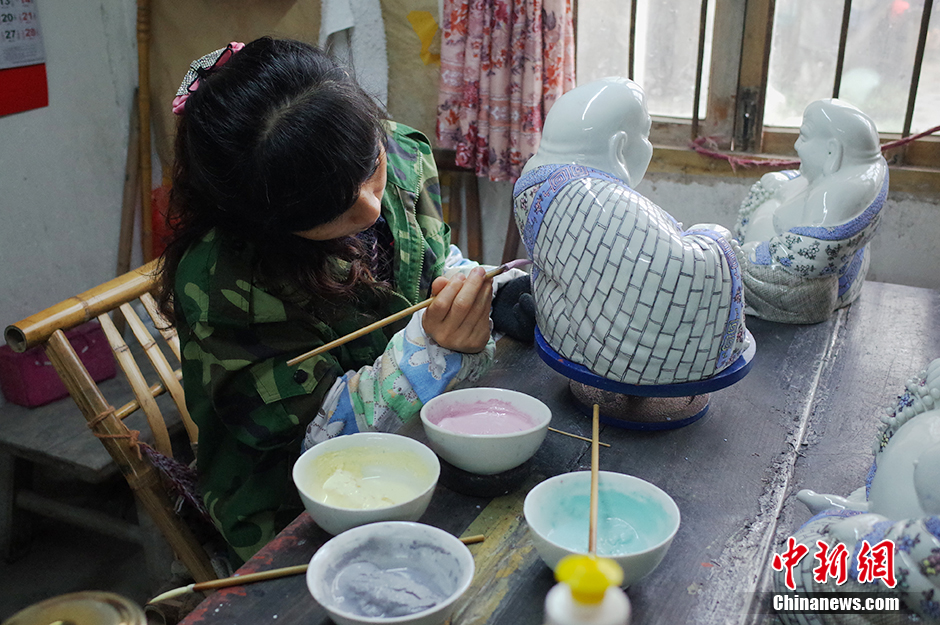 图为3月30日,江西景德镇,画工正在给瓷器上色。 中新网记者 李卿 摄