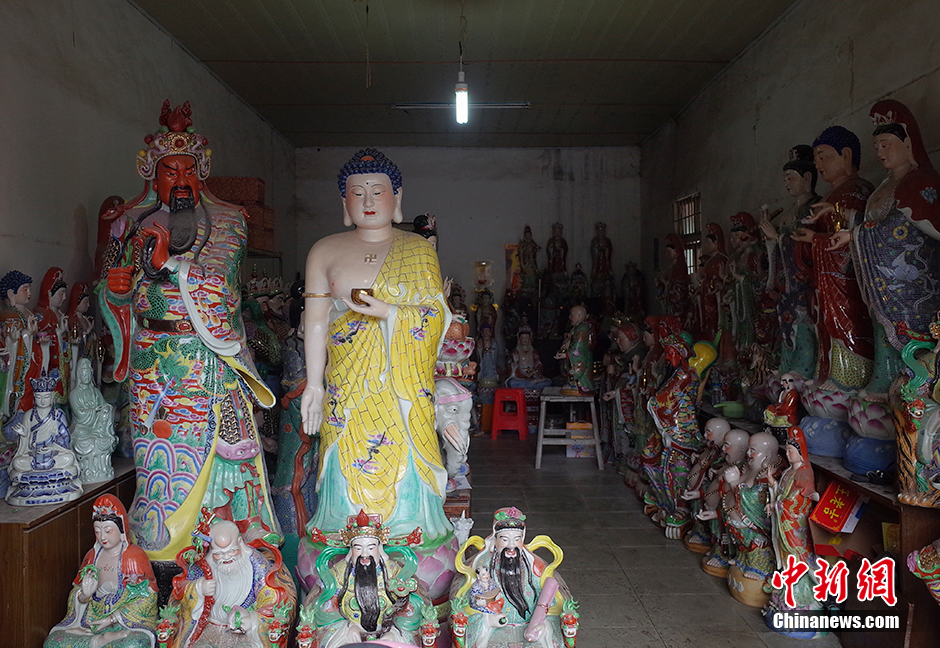 经过红炉的低温烧烘,粉彩会固定在瓷器上,这样就形成了基本的彩瓷。图为3月30日,江西景德镇,烧制完成的神像瓷器摆放在店铺内出售。 中新网记者 李卿 摄