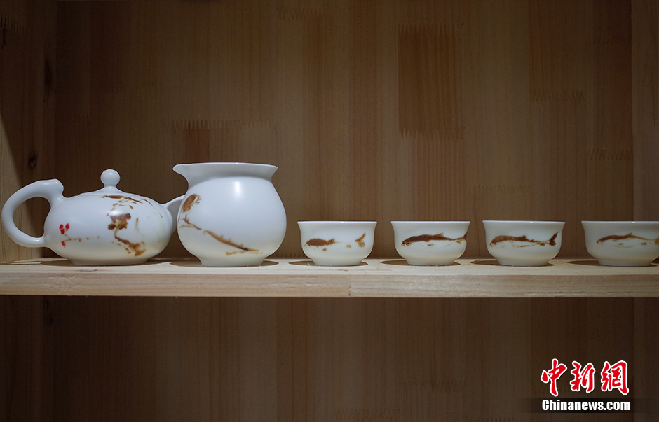 画工在素胎上作画时所见的颜料色,在经过高温烧制和烘烤后会发生很大变化。一件瓷器上的优美色彩,蕴含的都是画工们多年积累的丰富经验。图为3月30日,江西景德镇,一个店铺内摆放的陶瓷茶具。 中新网记者 李卿 摄