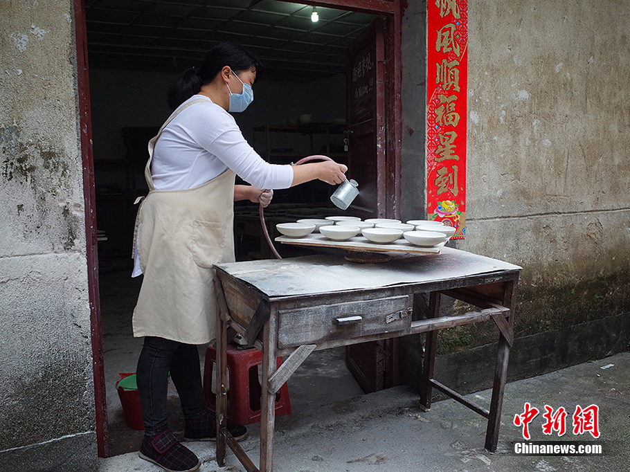 定型后的陶坯放置晾干,进行上釉工序。大部分陶瓷制品均需经施釉后才能进窑烧造。不同种类的釉经过高温烧制后会变化出不同色彩。图为3月30日,江西景德镇,一名工人正在给陶坯进行喷釉。 中新网记者 李卿 摄
