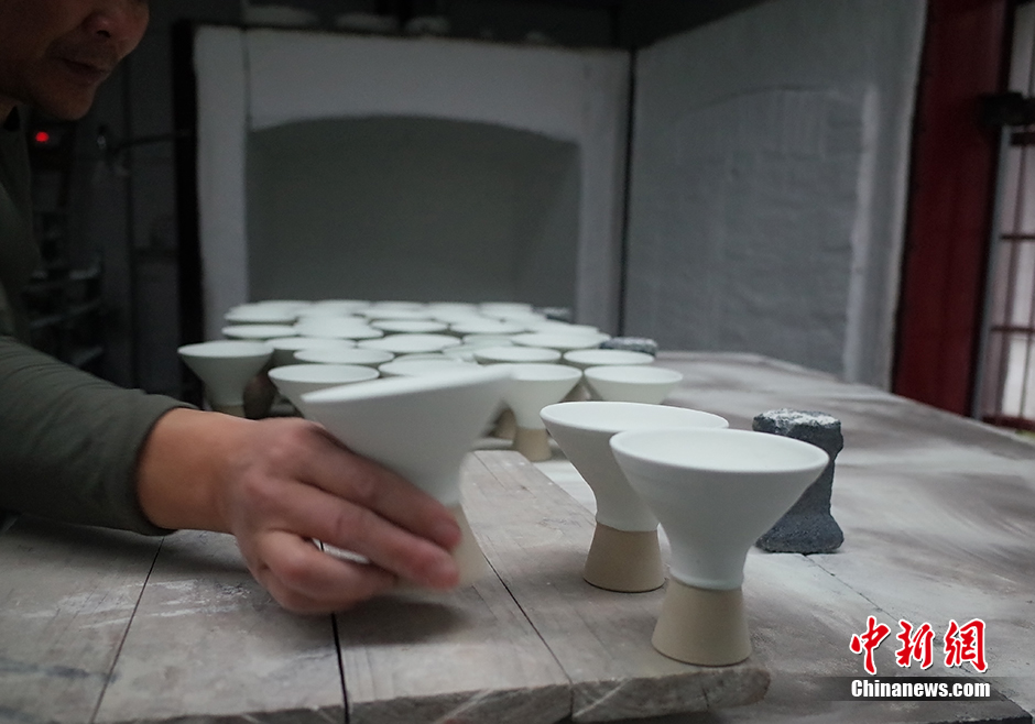 图为3月30日,江西景德镇,烧制工人检查每一个准备入窑的器件,将上面灰尘除去。 中新网记者 李卿 摄