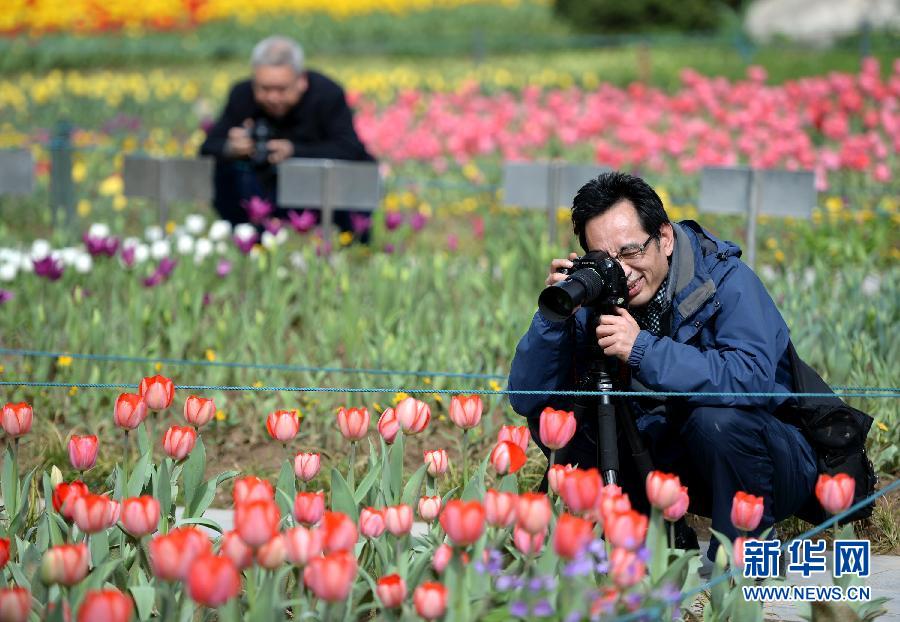 4月2日,摄影爱好者在西安植物园内拍摄郁金香。 4月1日,西安植物园第二十三届郁金香花展开幕,吸引了众多游人前来踏春赏花。花展共展出50个品种近15万株郁金香,以及欧洲水仙、风信子、南非万寿菊等10万株各类花卉,展览将持续至5月10日。新华社记者 李一博 摄