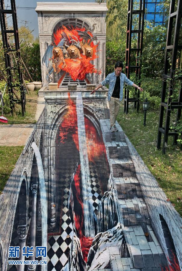 4月2日,在上海金山枫泾古镇“波兰倒置屋”景区,一名游客与手绘3D画“互动”。日前,5幅不同风格的3D画亮相上海枫泾古镇“波兰倒置屋”景区。这些栩栩如生的3D画由波兰画师手绘完成,游客站在立体画的特定位置、按特定的角度做出一定的姿势,就能拍出立体感很强的照片,体验到置身画中的感觉。新华社发(庄毅 摄)