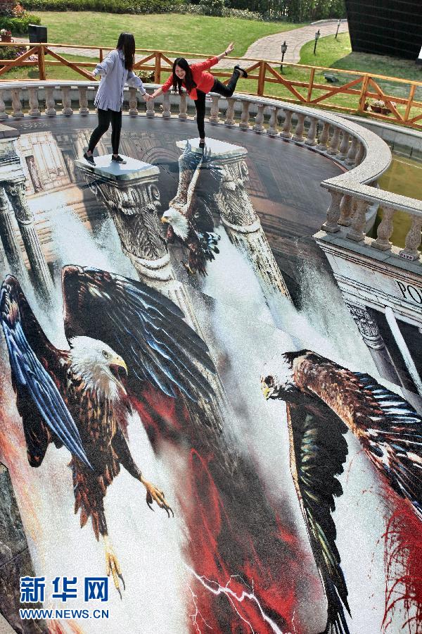 4月2日,在上海金山枫泾古镇“波兰倒置屋”景区,游客与手绘3D画“互动”。日前,5幅不同风格的3D画亮相上海枫泾古镇“波兰倒置屋”景区。这些栩栩如生的3D画由波兰画师手绘完成,游客站在立体画的特定位置、按特定的角度做出一定的姿势,就能拍出立体感很强的照片,体验到置身画中的感觉。新华社发(庄毅 摄)