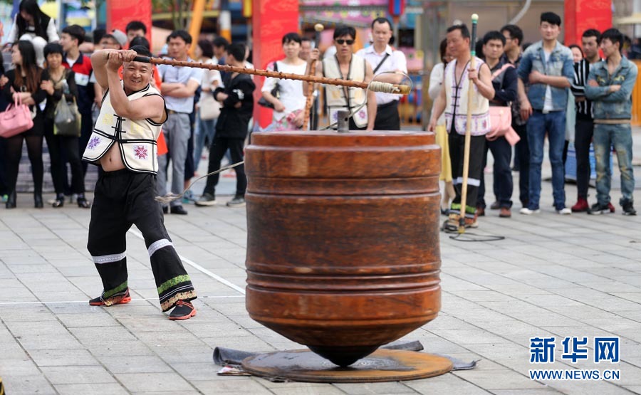 4月2日,长沙世界之窗公园里来自贵州六盘水市的陀螺爱好者正在抽打一个巨型陀螺。