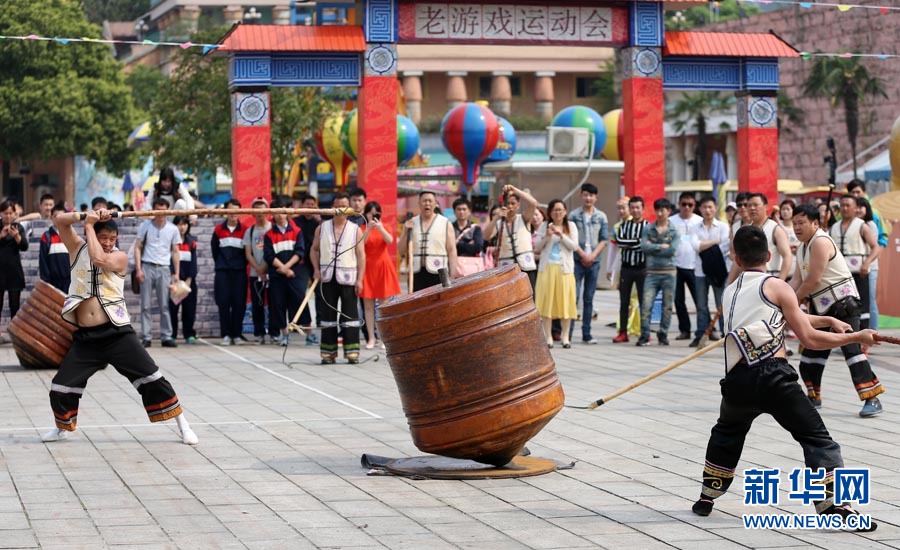 清明假期将至,长沙世界之窗公园推出了“老游戏运动会”,来自青海互助土族自治县的演员们带来了土族轮子秋表演,来自贵州六盘水市的陀螺爱好者在运动会上打起了巨型陀螺,而入园的游客们可以参加滚铁环、跳房子、踢毽子等游戏,体验传统体育游戏的魅力。新华社记者李尕摄